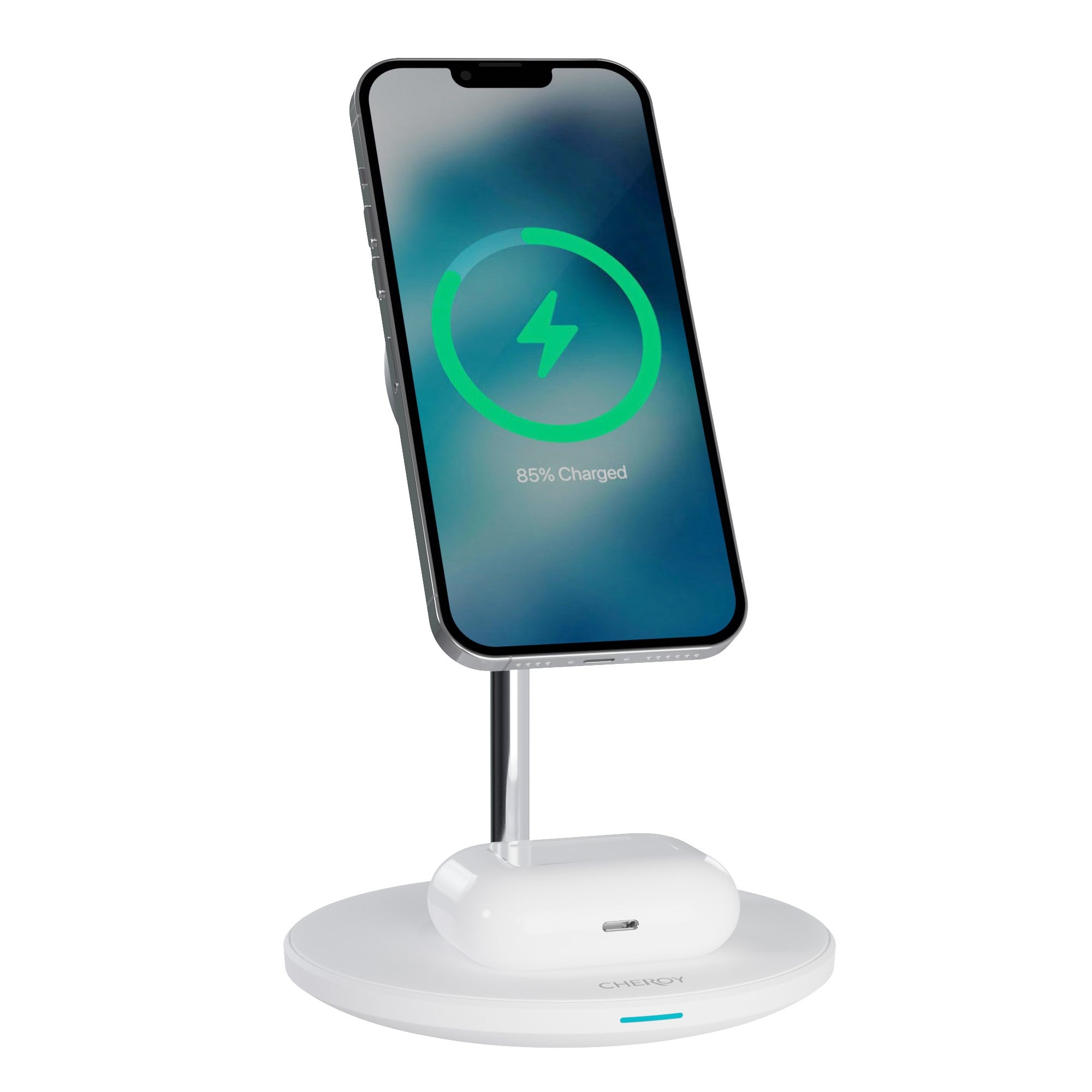 Laad twee Apple-apparaten tegelijk op met onze 2-in-1 draadloze laadstandaard met MagSafe. Hij werkt met officiële MagSafe-technologie om je MagSafe-compatible iPhone moeiteloos en snel draadloos op te laden. De laadstandaard is voorzien van een horizontaal laadoppervlak op de voet voor het opladen van je AirPods. Dit is een opvallende, stijlvolle lader met roestvrijstalen afwerking die goed past in elk interieur, van woonkamer tot kantoorruimte.